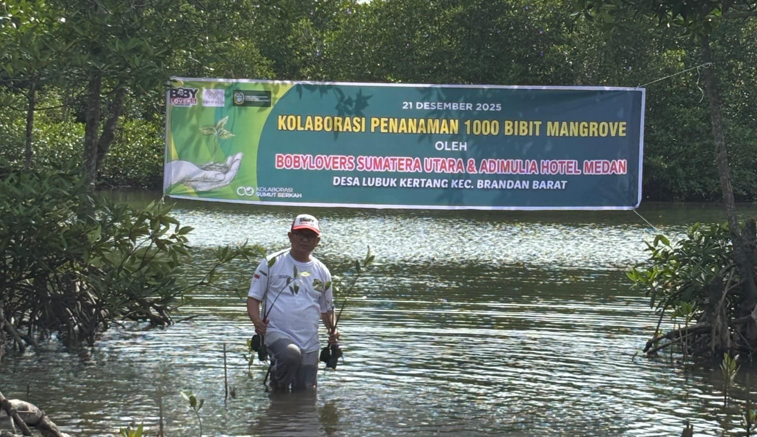 RMN, Langkat – Bobylovers Sumatera Utara (Sumut) kembali menunjukkan komitmennya dalam menjaga kelestarian alam dengan menanam seribu bibit mangrove berkolaborasi dengan Adimulia Hotel Medan di Desa Lubuk Kertang, Kec. Brandan Barat, Kab. Langkat pada Minggu (21/12) menjadi agenda lanjutan dalam upaya rehabilitasi kawasan pesisir yang mengalami abrasi dan kerusakan ekosistem.