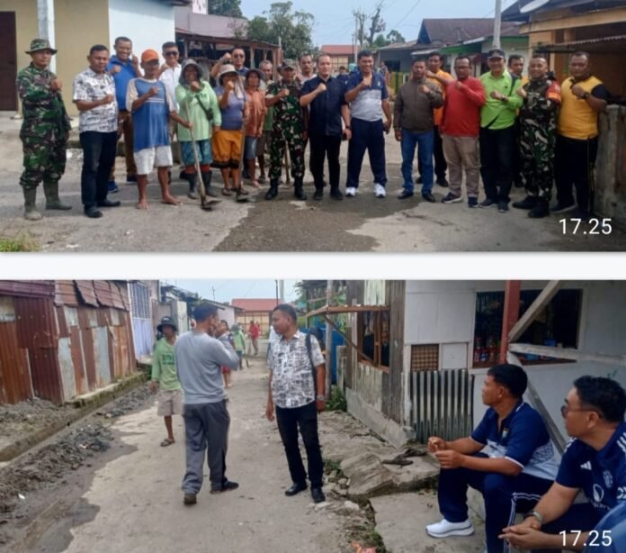 RMN, Siantar – Kapolsek Siantar Marihat AKP Doni Simanjuntak SH dan personil mengikuti kegiatan gotong royong yang dilaksanakan tiga pilar yakni Kecamatan, Polsek dan Koramil bersama masyarakat yang berlangsung di Jalan Parapat Gang Banjar Nahor, Kelurahan Tong Marimbun Kecamatan Siantar Marimbun Kota Pematangsiantar, pada hari Jumat 17 Oktober 2025 pagi pukul 07.30 Wib.