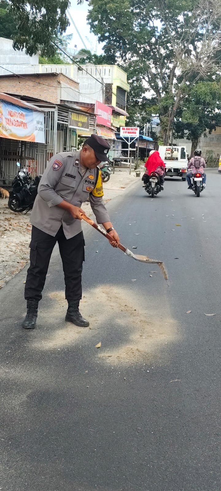 Lalu Bhabinkamtibmas mengajak pihak Kelurahan Naga pita dan pihak SPBU No. 13 .211. 118 menabur pasir agar kondisi Jalan atau Aspal tidak licin lagi kemudian juga menghimbau Pengendara tetap berhati-hati dan memasang Plang di sekitaran tumpahan solar.
