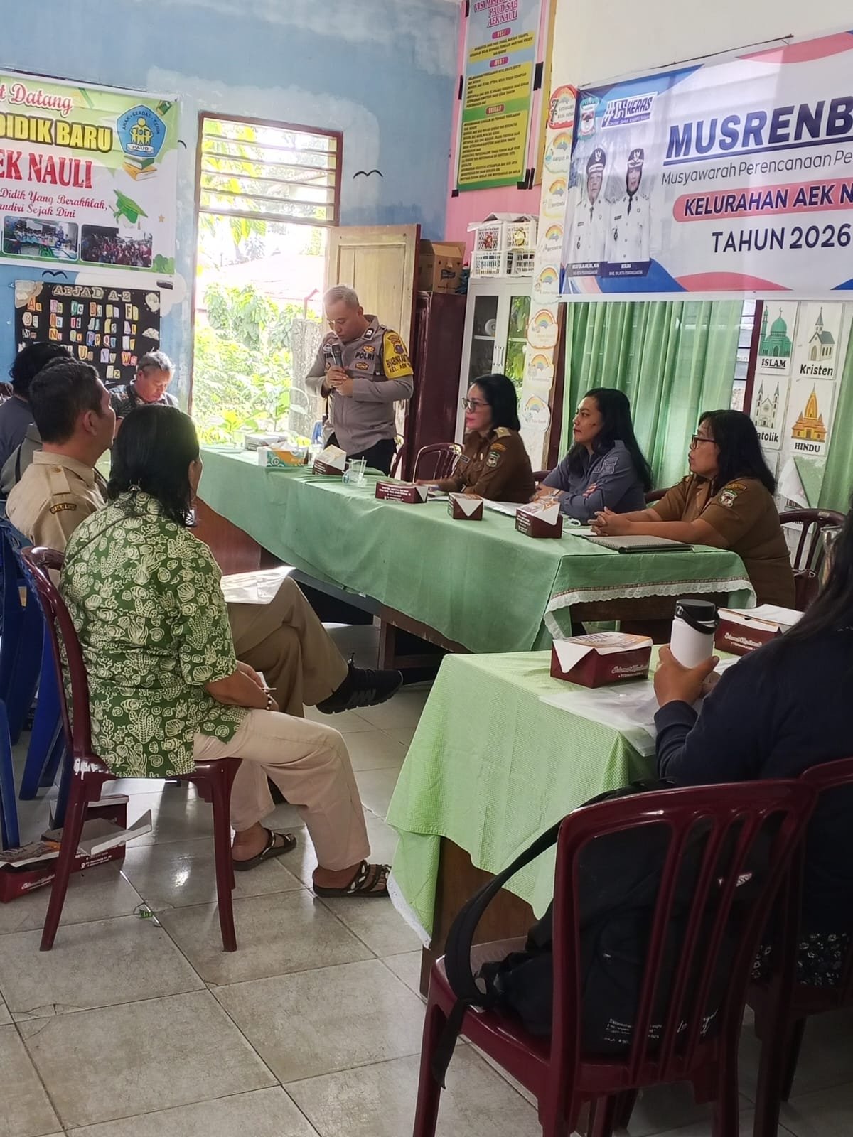 RMN, Siantar – Polsek Siantar Selatan Polres Pematangsiantar melalui Bhabinkamtibmas Kelurahan Aek Nauli Aipda Herry Susanto Tarigan SH menghadiri kegiatan Musrenbang (Musyawarah Perencanaan Pembangunan) di Kantor Kelurahan Aek Nauli, Kecamatan Siantar Selatan, pada hari Selasa, 27 Januari 2026 pagi sekira pukul : 10.00 Wib.