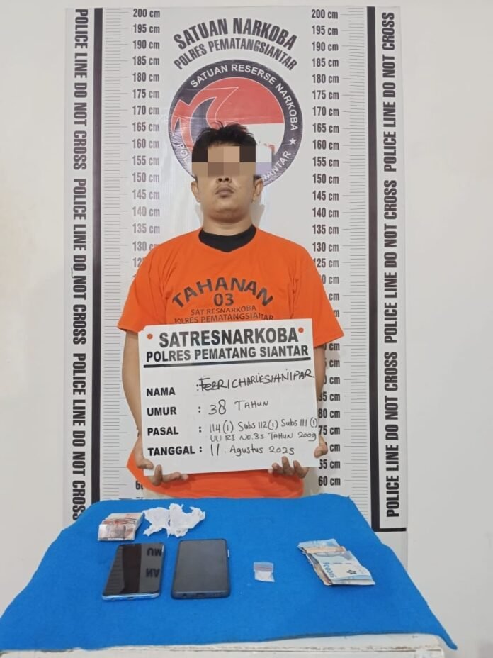 RMN, Siantar – Polres Pematangsiantar Melalui Sat res Narkoba Berhasil menangkap seorang laki laki berinisial FCS (35) warga Jalan Merbau Kelurahan Kahean Kecamatan Siantar Utara Kota Pematangsiantar memiliki narkotika jenis sabu berat bruto 1.56 Gram di pinggir Jalan Gotong Royong Kelurahan Kahean Kecamatan Siantar Utara Kota Pematangsiantar, pada Senin 11 Agustus 2025 malam sekira pukul 21.20 WIB.