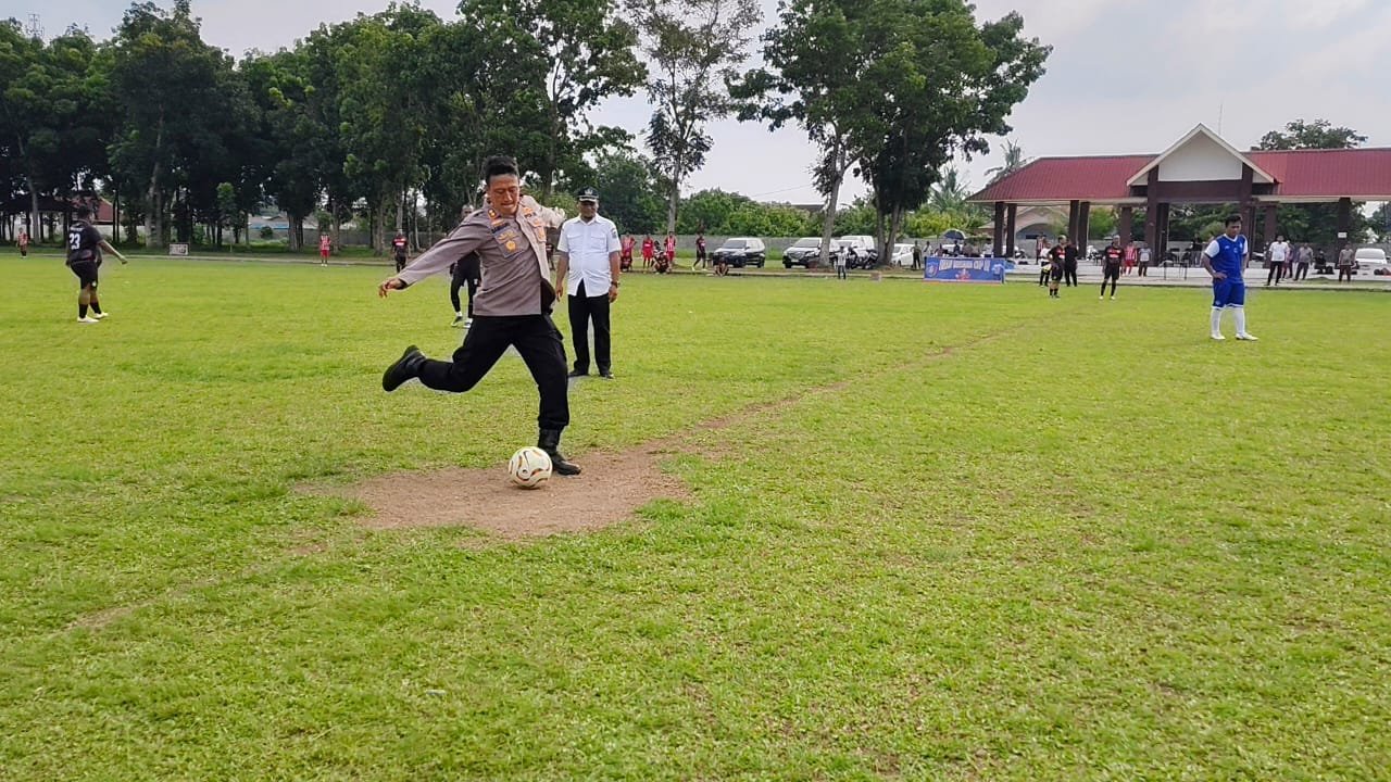 Kapolres Binjai Lakukan Tendangan Bola Pertama Dalam Pembukaan Turnamen