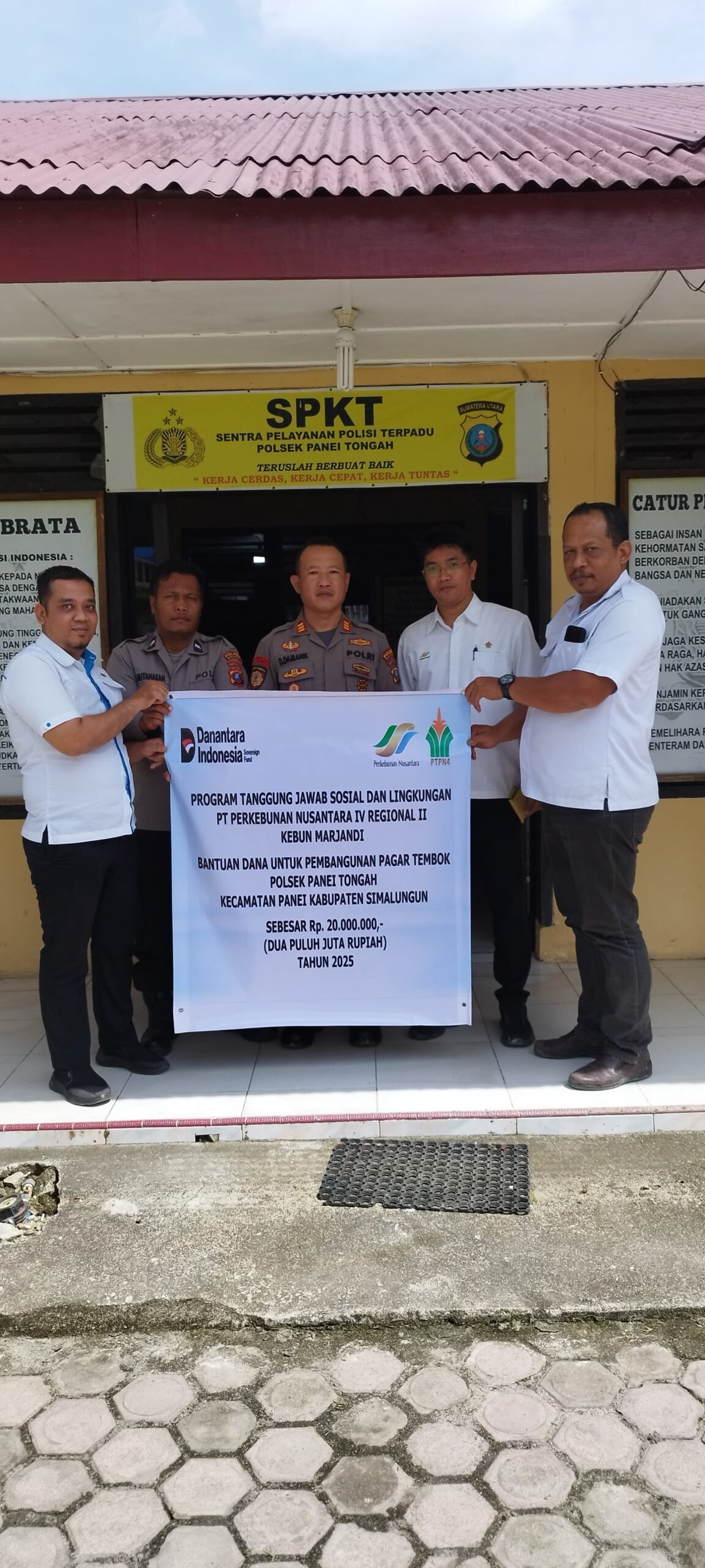 Kapolsek Panei Tongah, Daniel Jani Damanik mengucapkan terimakasih yang sebesar besarnya kepada PTPN IV Regional II Kebun Marjandi atas bantuan dana program TJSL untuk pembangunan pagar tembok Kantor Polsek Panei Tongah. “Semoga kedepan perusahaan PTPN IV semakin jaya dan berkah, serta dapat terus memberikan bantuan secara berkelanjutan kepada masyarakat sekitaran kebun,” ujar Kapolsek.