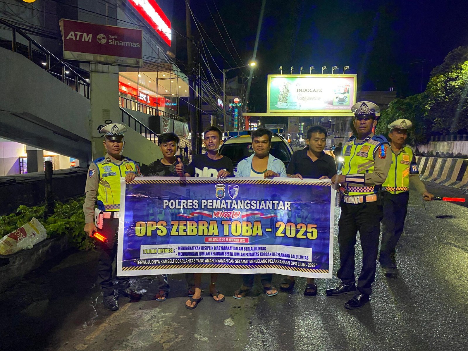 RMN, Siantar – Dalam rangka Operasi Toba Tahun 2025, Polres Pematangsiantar melalui Satuan Lalu lintas (Sat Lantas) melaksanakan sosialisasi kepada masyarakat pengguna jalan di Jalan WR Supratman depan Siantar Hotel Kelurahan Dwikora Kecamatan Siantar Barat Kota Pematangsiantar, pada Rabu 19 November 2025 malam sekira pukul : 20.00 Wib.