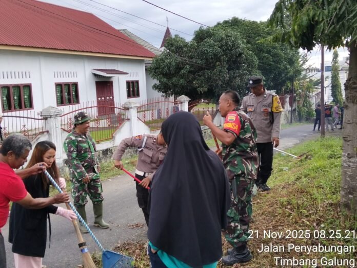 RMN, Siantar – Polseķ Siantar Siantar Barat Polres Pematangsiantar melalui Bhabinkamtibmas Aiptu Deddy Syam dan Aiptu R.P Damanik dan Kanit Provos Aipda Ricki M mengikuti kegiatan gotong royong di Jl. Penyambungan Kelurahan Timbang Galung Kecamatan Siantar Barat Kota Pematangsiantar, Jumat 21 November 2025 pagi pukul : 08.00 Wib.