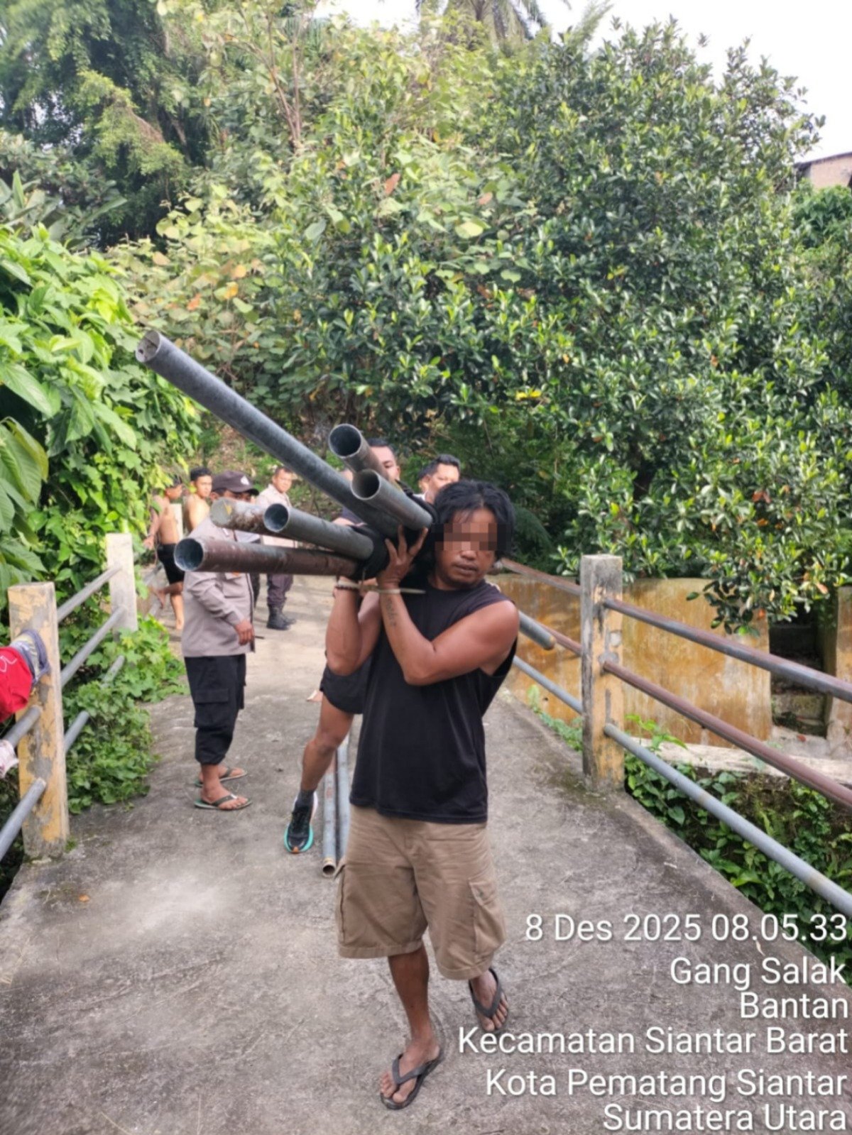 RMN, Siantar – Tindak lanjut laporan dari masyarakat (Tinjut Lapmas) 110, Polres Pematangsiantar melalui personil piket Polseķ Siantar Barat gerak cepat amankan seorang terduga pelaku pencurian besi jembatan yang terletak di Jalan Bila Kaki Gang Setia kawan Kampung Banjar Kelurahan Banjar Kecamatan Siantar Barat Kota Pematangsiantar, Senin 8 Desember 2025 pagi sekira pukul 08.30 Wib.