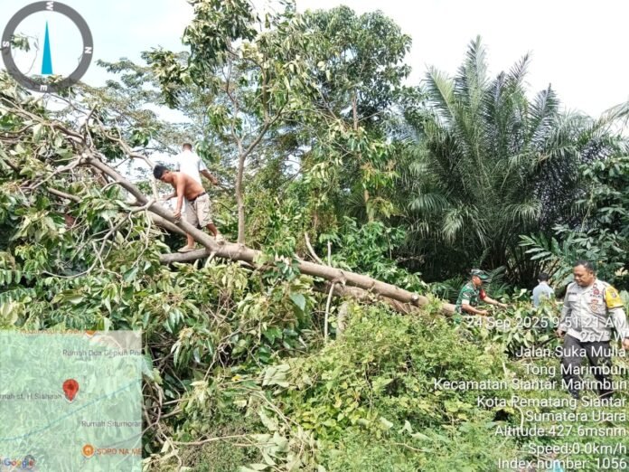 RMN, Siantar – Polsek Sianțar Marihat Polres Pematangsiantar melalui Bhabinkamtibmas Kelurahan Tong Marimbun Aiptu Isdianto melaksanakan kegiatan gotong royong bersama masyarakat membersihkan material rumah terkena pohon tumbang di Jl. Suka Mulia, Kelurahan Tong Marimbun, Kecamatan Siantar Marimbun, Kota Pematangsiantar pada Rabu 24 September 2025 pagi pukul 09.00 Wib.