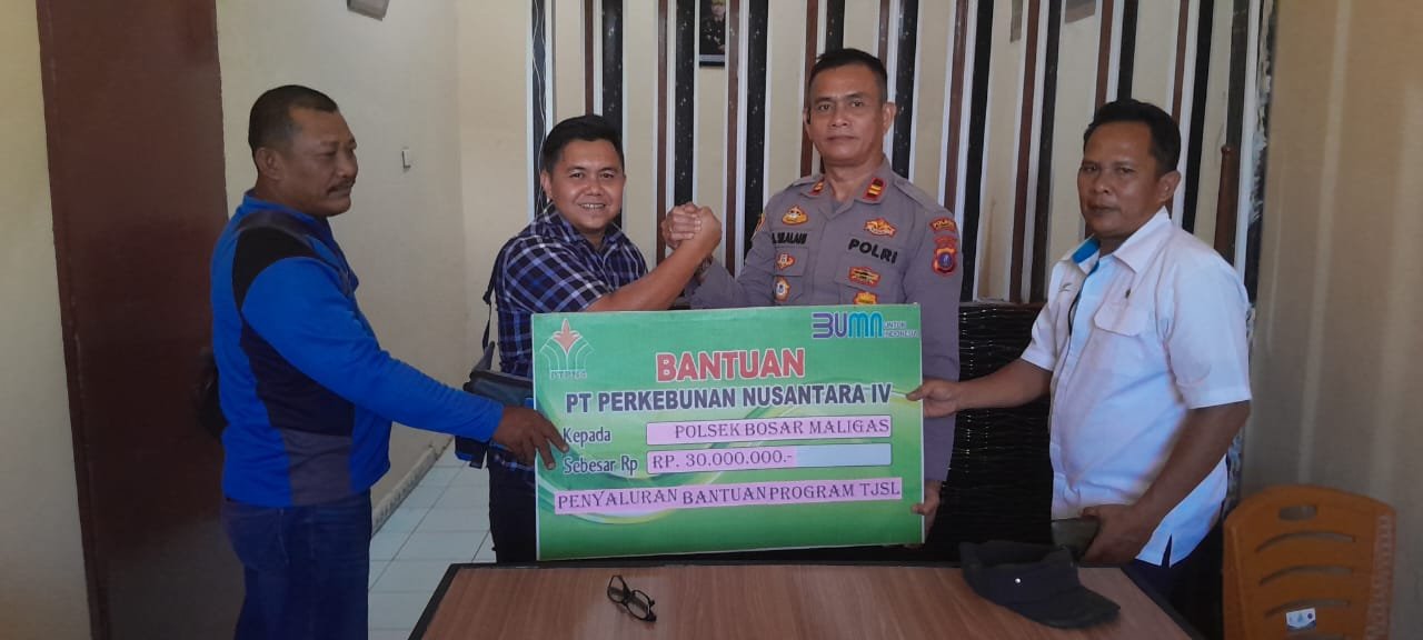 Sebagai jawaban atas proposal yang dibuat mapolsek Bosar Maligas dengan Nomor : B/139/V/2025/Reskrim perihal pengajuan proposal renovasi dan peningkatan fasilitas unit Reskrim Polsek Bosar Maligas, pada Rabu (23/07/2025) siang sekira pukul 14.17 WIB bertempat di ruang dinas Kapolsek Bosar Maligas.PTPN4 regional II dalam hal ini diwakili oleh Mawan Kurniawan, SE (APK) kebun Gunung Bayu yang didampingi Fahmi Sahuri (karyawan administrasi) dan Pairin (danton), menyalurkan bantuan dari program TJSL kepada Polsek Bosar Maligas yang diterima langsung oleh Kapolsek Bosar Maligas IPTU Sonni G. Silalahi, SH.