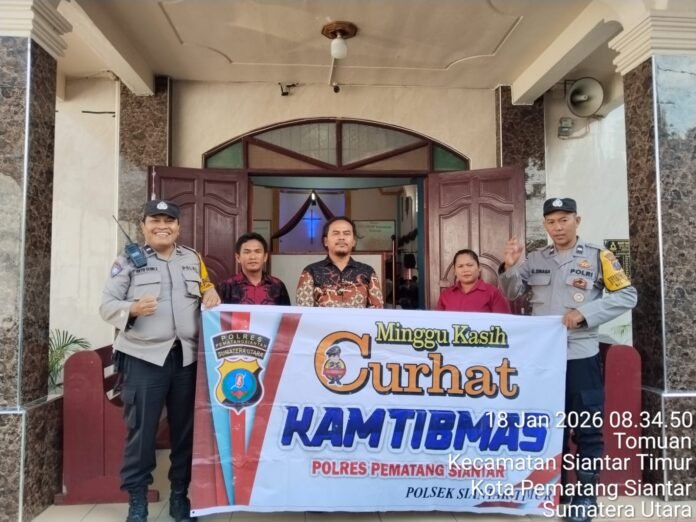 RMN, Siantar – Polsek Siantar Timur Polres Pematangsiantar melalui Pket Bhabinkamtibmas Aiptu Okto Sihole dan Aipda G. Sinaga melaksanakan kegiatan Minggu Kasih Curhat Kamtibmas di Gereja HKBP Tomuan, Jalan Dalil Tani, Kelurahan Tomuan Kecamatan Siantar Timur Kota Pematangsiantar, Minggu 18 Januari 2026 pagi sekira pukul 09.00 Wib.