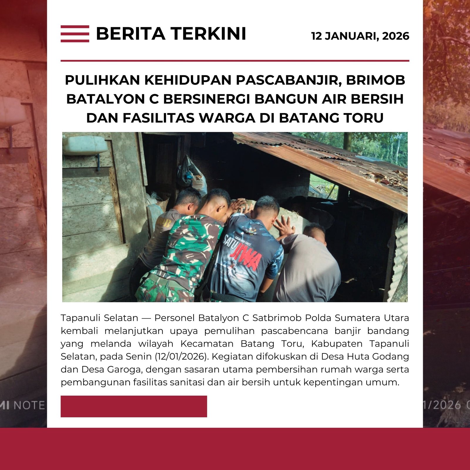RMN, Tapsel – Personel Batalyon C Satbrimob Polda Sumatera Utara kembali melanjutkan upaya pemulihan pascabencana banjir bandang yang melanda wilayah Kecamatan Batang Toru, Kabupaten Tapanuli Selatan, pada Senin (12/01/2026). Kegiatan difokuskan di Desa Huta Godang dan Desa Garoga, dengan sasaran utama pembersihan rumah warga serta pembangunan fasilitas sanitasi dan air bersih untuk kepentingan umum.
