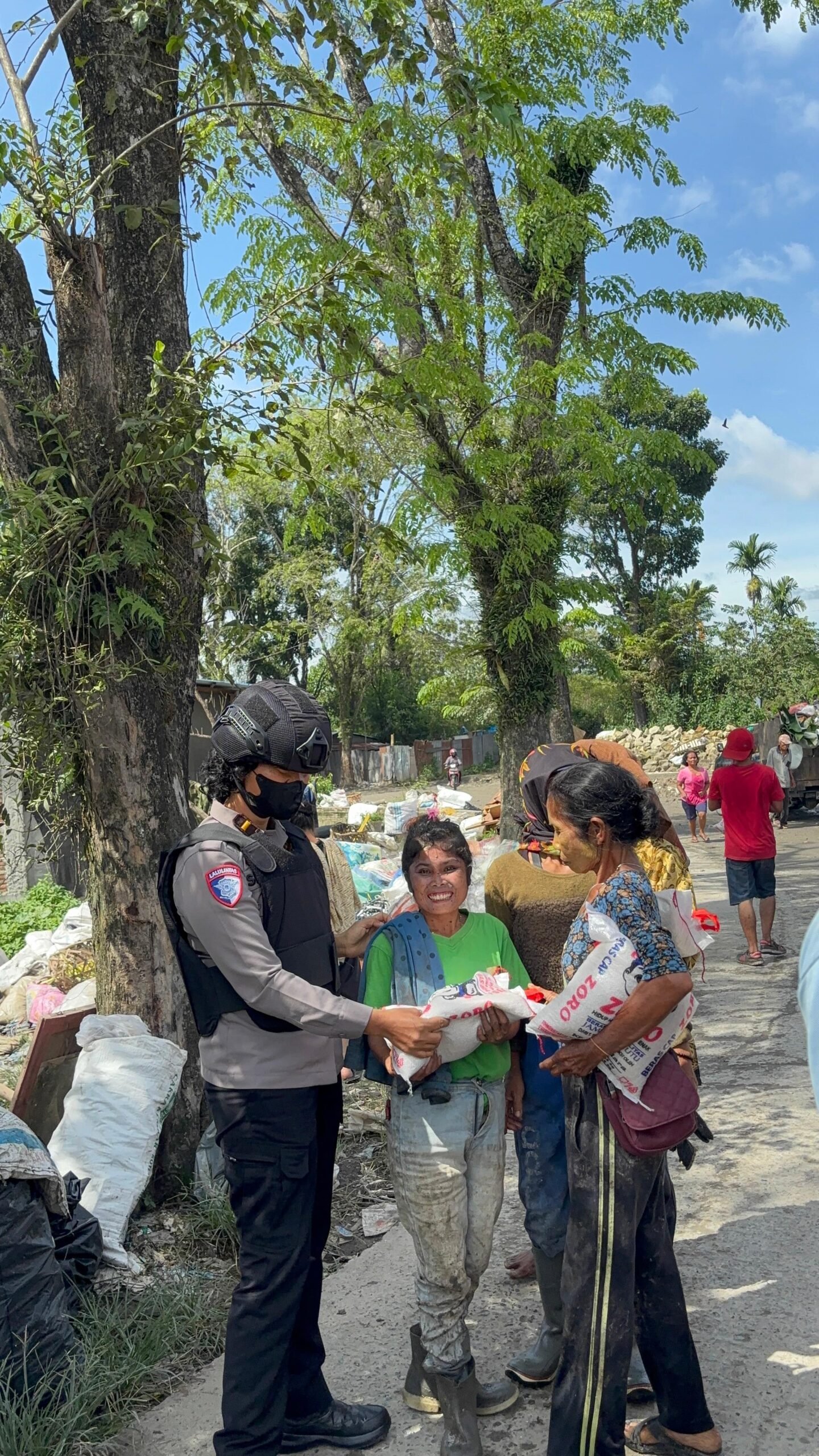 Kemudian IPDA Serly Tarigan bersama Tim Patroli Srikandi Polwan membagikan bantuan sembako berupa beras 5 Kg kepada masyarakat bekerja pemulung di wilayah TPA (Tempat Pembuangan Akhir) Tanjung Pinggir sembari memberikan himbauan antisipasi gangguan Kamtibmas.